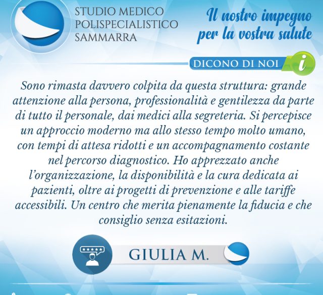 Gentilissima signora Giulia, la ringrazio, di cuore, a nome mio e delle segretarie, per le sue belle parole nei nostri confronti e per aver apprezzato ed evidenziato quella che è la “missione” dello studio: centro medico di vicinanza alle persone, con attenzione ai loro problemi di salute. Il suo...